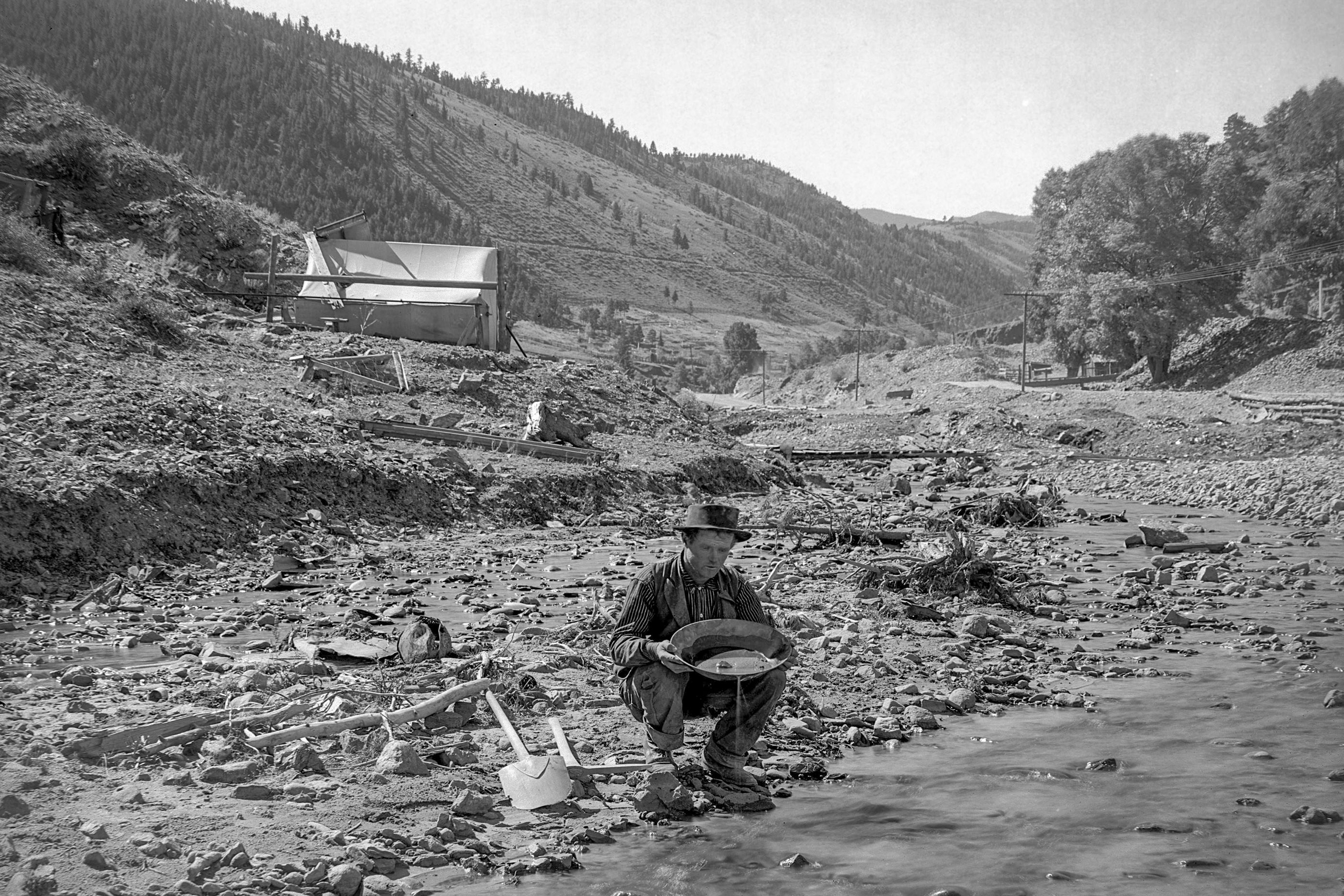 Miner with gold pan, pick, and shovel panning on banks of Clear Creek near Idaho Springs, Colorado; a canvas frame tent and sluice box in background. The location is near where gold was first discovered in Colorado. Source: Colorado Public Radio